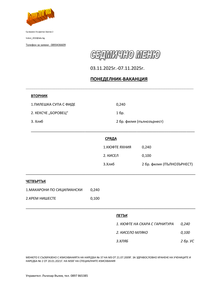 Меню за доставка на готова храна от „Кухня- майка“ с кетъринг за периода от 03.11.2025 г. до 07.11.2025 г.